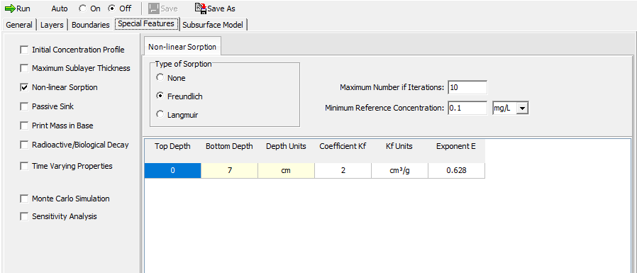 Used for non-linear sorption where the capacity of the soil to “grab” the contaminant changes based on concentration. Non-linear sorption is entered on the Special Features tab.