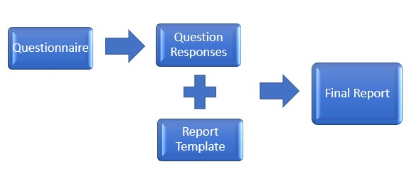 When the questionnaire is created it is associated with a report template that is used to create the merged report. Each question is associated with a keyword from the report template. These keywords are used as placeholders in the final report for the text associated with the question response. Depending upon the length of the report and number of questions, these first two steps can be very labor intensive. But after they have been completed, the resulting questionnaires can be used to generate thousands of reports.