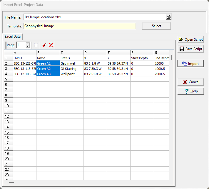 Excel import scripts are used to store the correspondence between an Excel spreadsheet and data in a boring and well log. In addition, for a new boring or well log the script file stores the template to be used.