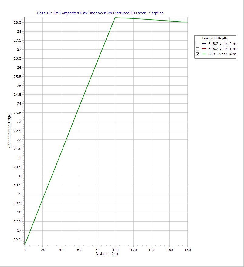 This example builds on earlier cases by modeling contaminant migration through a landfill barrier system that includes both compacted clay and a fractured till layer, while accounting for retardation due to sorption.