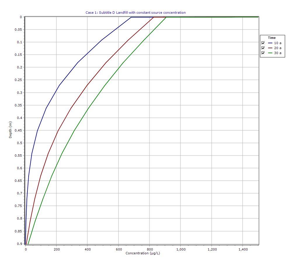 This example is a classic scenario used to simulate contaminant transport from a U.S. RCRA Subtitle D landfill with a composite liner system. We’ll break down the setup, key assumptions, model inputs, and interpret the results using graphs and downloadable PDF-style output suitable for reporting.