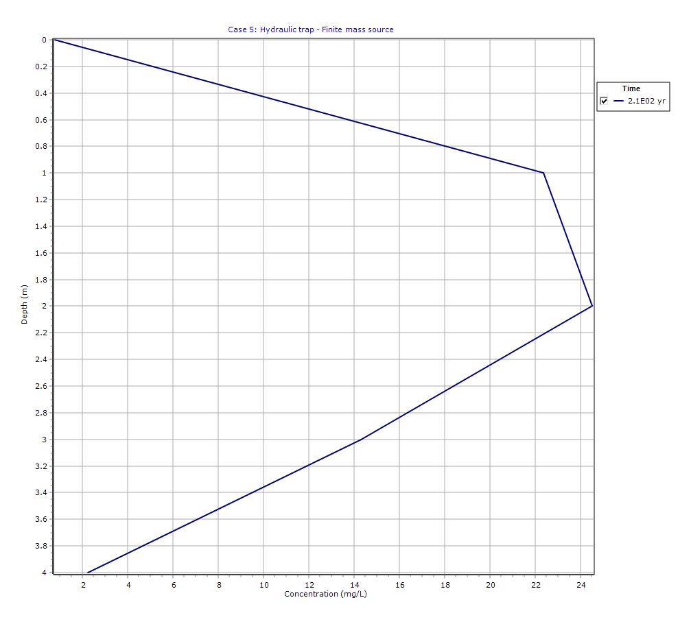 This scenario is critical in environmental modeling because it represents conditions where contaminant migration is naturally limited or even suppressed due to opposing hydraulic gradients. The example builds on Example 4 (finite mass source with leachate collection) but modifies flow conditions and aquifer properties to simulate this protective mechanism.